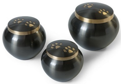brass urn, finished in brushed metal and adorned with delicate paw prints - a